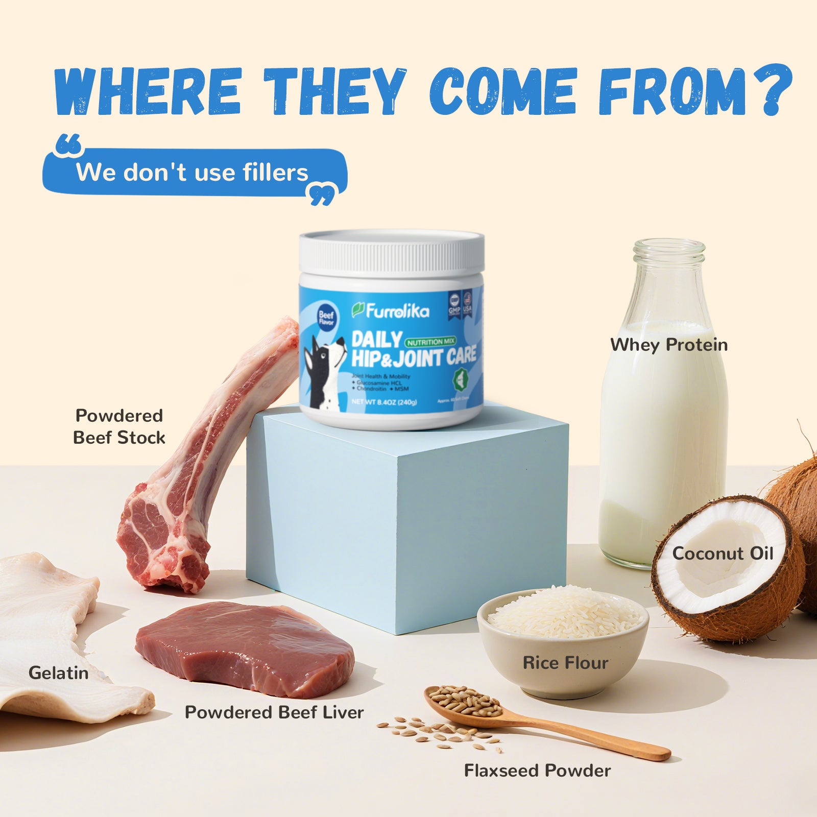 ADVANCED JOINT COMFORT FORMULA - Features Glucosamine HCl (from shellfish) & MSM to help support joint comfort associated with normal daily activity and support comfortable movement for your dog's hip and joint health. ENHANCED MOBILITY & FLEXIBILITY - Contains Chondroitin Sulfate & Hydrolyzed Collagen to support cartilage health, promote joint lubrication, and help maintain flexibility for active dogs. CONNECTIVE TISSUE SUPPORT - This blend includes vital Omega-3 Fatty Acids () & Vitamin C, working synergistically to maintain connective tissue health and support overall joint function for your canine companion. EASY DIGESTION & PALATABLE - Our delicious beef-flavored soft chews are easy to digest and formulated for nutrient absorption, suitable for dogs of all ages and breeds. MADE IN USA QUALITY - Trust Furrolika's premium dog hip and joint supplements, crafted in the USA with high-quality ingredients for your beloved pet's health. |